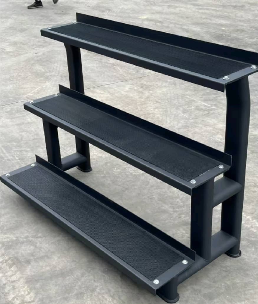 * Surface: Each tier has a textured, non-slip surface, likely rubber or a similar material, to protect both the kettlebells and the rack itself, and to provide grip.