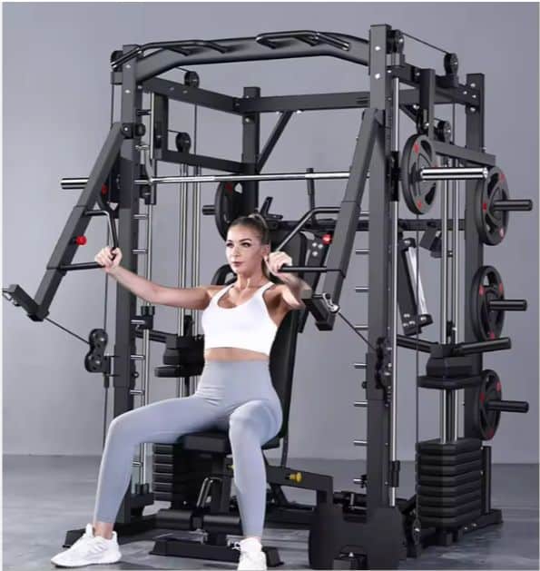 This is a multi-functional gym system, sometimes called an all-in-one trainer. It is a single, robust structure integrating a guided smith machine for safe, assisted bar movements, a versatile dual-pulley cable system for dynamic exercises, and a power rack for free weights. It also includes a pull-up bar. This heavy-duty steel apparatus is a space-saving solution for full-body workouts.